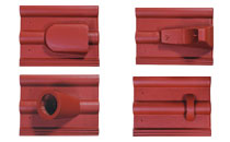 Оранжевые элементы цементно-песчаной черепицы. Пазовая черепица: Для крепления к обрешётке имеются два отверстия. Коньковая черепица: Для крепления к коньковому брусу имеется одно отверстие. Предназначена для обустройства конька и хребта кровли. Фронтонная (правая, левая) черепица: Для крепления к обрешётке имеются два отверстия. Предназначена для обустройства фронтона кровли. Половинчатая черепица. Подножечная черепица: Для крепления к обрешетке имеются два отверстия и специальный выступ для дополнительной обрешетки. Предназначена для крепления решеток, для безопасного передвижения по крыше. Вентиляционная черепица: Для крепления к обрешётке имеются два отверстия. Элемент системы вентиляции. Предназначена для вентиляции кровли. Проходная черепица: Для крепления к обрешётке имеются два отверстия. Разрушающая нагрузка на изгиб не менее 1,2 кН. Предназначена для прохода через кровлю мачты антенны и других систем. Снегозадерживающая черепица: Для крепления к обрешётке имеются два отверстия. Элемент системы снегозадержания. Предназначена для удерживания снега на крыше, уменьшения лавиноопасности.